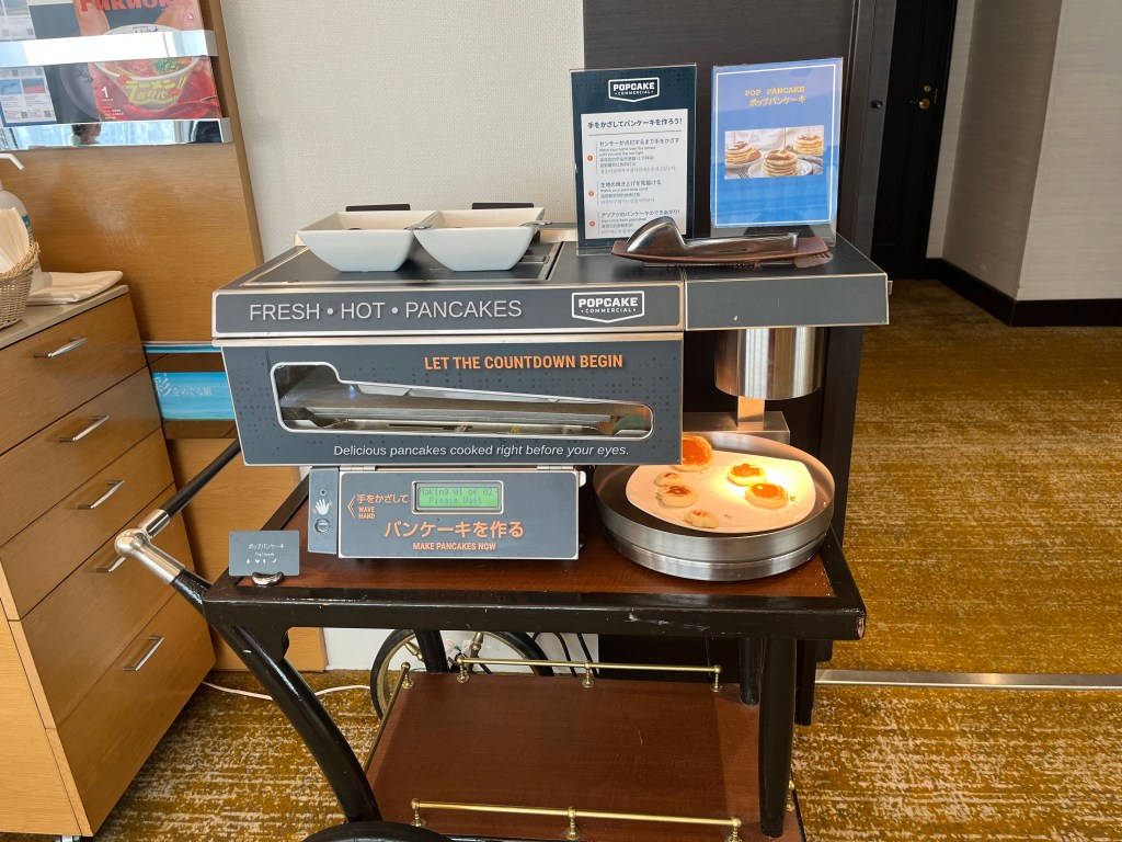 手をかざすとパンケーキの生地が落ちて、ベルトコンベアのように流れていく間にパンケーキが出来上がる仕組み(最後は丸いところに落ちるのをお皿に乗せます)