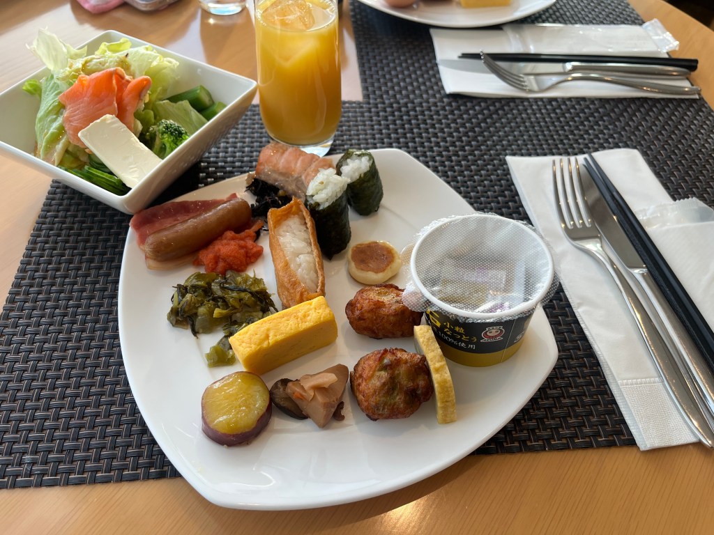 納豆は好きで家で時々食べるけど、パックを洗うのが一手間になるけど、ホテルで食べるとパックを水洗いしなくていいから楽。